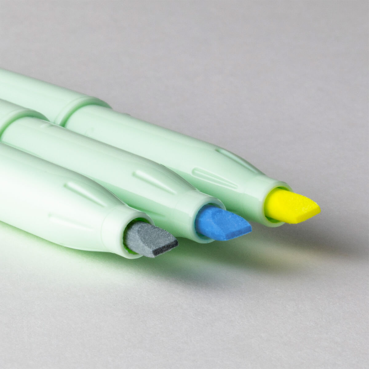 Available in three understated tones — soft yellow, sky blue, and gray — This highlighter moves away from the conventional intensity of typical neon highlighters. Instead, it highlights key information with a soft presence, maintaining legibility while gently drawing attention to what matters. Perfect for meeting notes, study materials, and planners, it adds a calm and elegant touch to every page.
